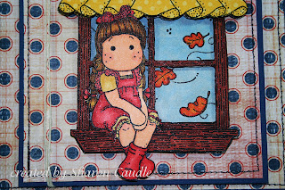 For this card, I used three stamps from Magnolia-licious. Jam Tilda is so precious and she's from the newest fall collection A Little Yummy for your Tummy which is available for preorder right now over at Magnolia-licious. (I think Diana might be rearranging things right now, cause the stamp image is gone this very moment. But I'm sure it will be back momentarily). I propped her up on the window, #547, which I stamped and cut out four times. twice in white and twice in patterned paper for the curtain. And all of that is popped up from #559 fall background. I'm telling you, this card looks really simple, but it took me forever to accomplish! LOL! I think I used an entire roll of dimensional tape on it. I'm sorry, I don't know who the DP is by, but the card base and layering cardstock are bth Bazzill. I used cryogen white for Tilda. It has just a hint of glitter in it. And for some reason, in these pics, the glitter really decided to rear it's head. The recipient will be able to attest to the fact that it does NOT look all glitery in person. It's just enough to give the image a little life. I love the stuff, thanks to Jacque! *smiles*
