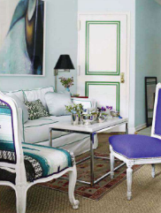 Olsen brought this room to life using bold pieces mixed with smaller pieces. His use of color against the light blue walls is perfection. A marble remnant, mercury glass, a rug, expensive remnants of fabric, and perfect placement of furnishings finish this warm home.